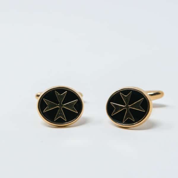 18kt Solid gold cuff links with Maltese Cross on a black enamel background.