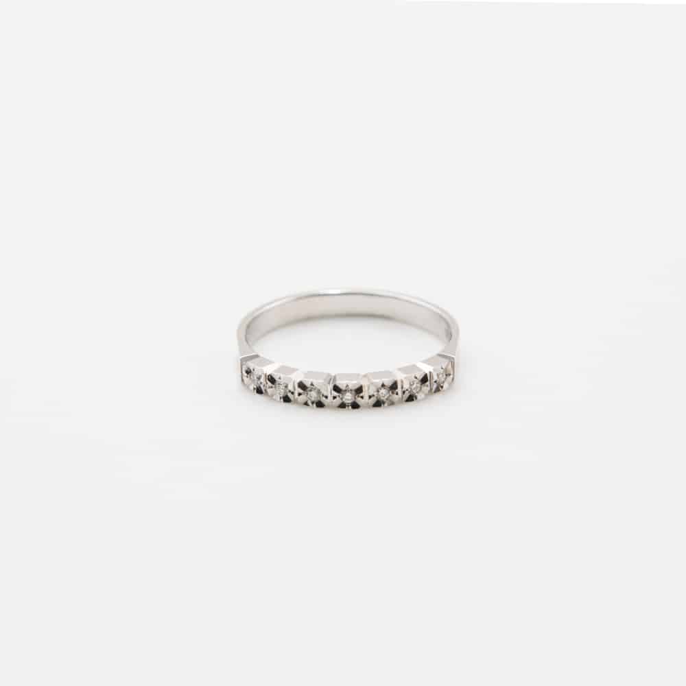 18kt Solid white gold with 7 diamonds amounting to 0.08ct in a diamond cut setting.