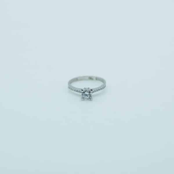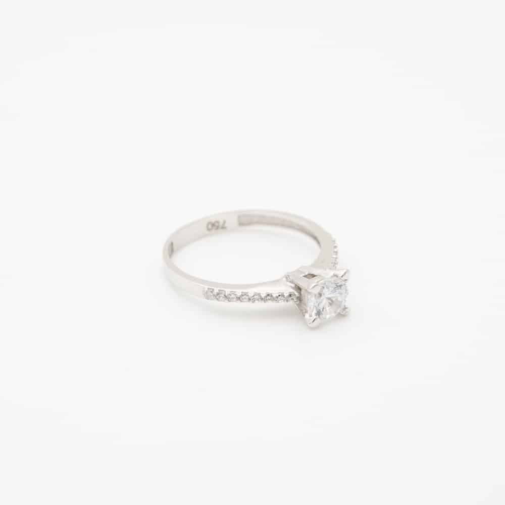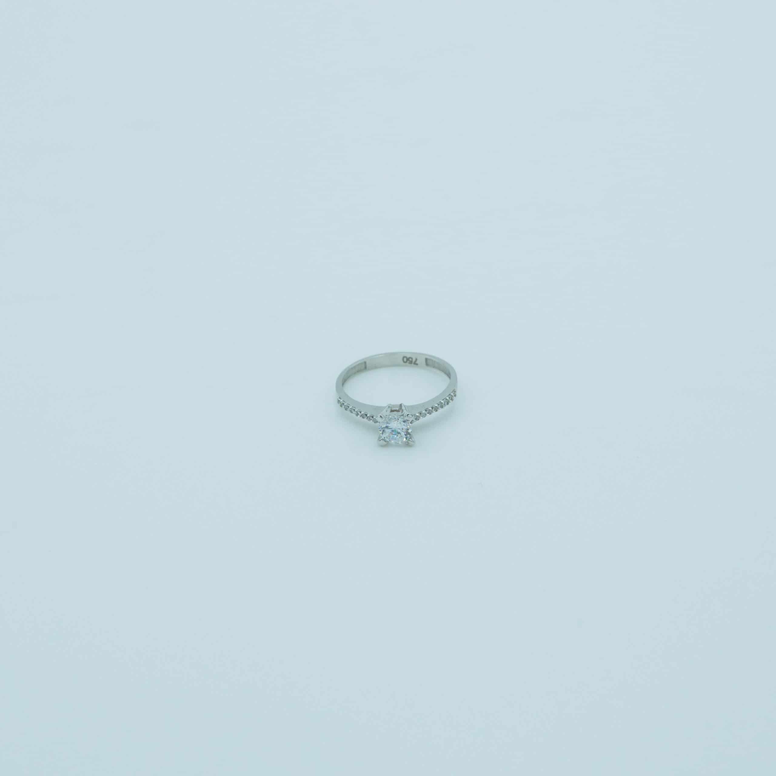 18kt White gold ring with 5mm round cubic zirchonia solitaire in a square setting and cubic zirchonia on either side of the band. Perfect as an engagement ring. Ring size adjustable on order.